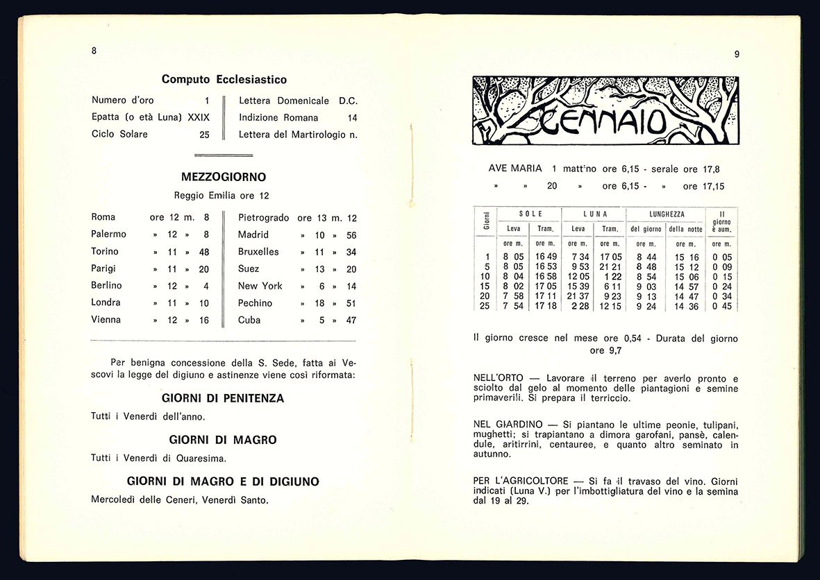 In 8vo (mm 167x120); pp. 233, [7]. Brossura editoriale. Osservatore Metereologico ed Astronomico dei Pianeti e delle Stelle che studia il tempo e predice le stagioni. Pronostici, riflessioni astrologiche effemeridi del Sole e della Luna - Fiere, Mercatoni, Mercati - Rubriche aggiuntive per l'ortolano, l'agricoltore, il giardiniere e altre notizie utili per tutti.