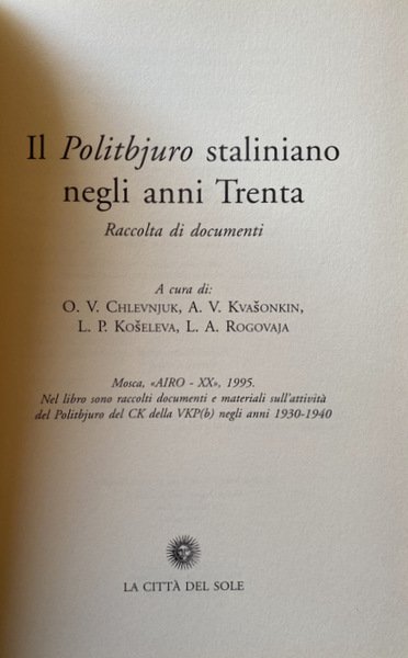 IL POLITBJURO STALINIANO NEGLI ANNI TRENTA. RACCOLTA DI DOCUMENTI.