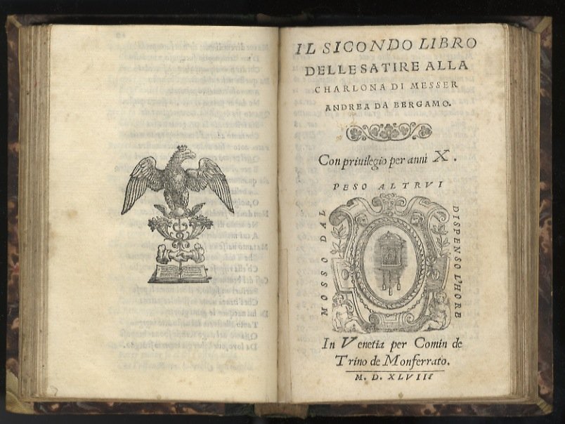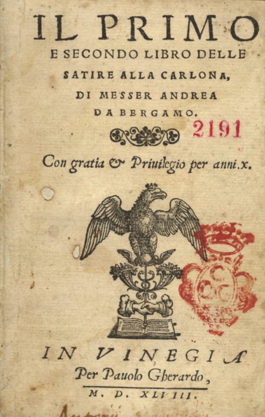 Il primo e secondo libro delle satire alla carlona di messer Andrea da Bergamo. In Vinegia, per Pauolo Gherardo, 1548. [Legato con:) [NELLI Pietro]. Il sicondo [sic] libro delle satire alla charlona di messer Andrea da Bergamo. In Venetia, per Comin de Trino de Monferrato, 1548.