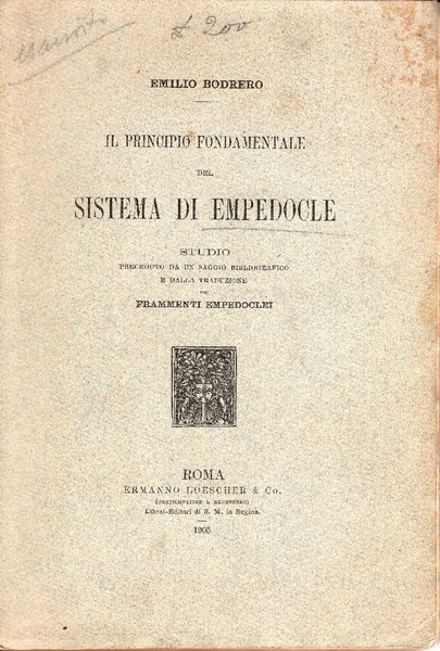 Il principio fondamentale del Sistema di Empedocle. Studio preceduto da un saggio bibliografico e dalla traduzione dei frammenti empedoclei | Libri antichi e moderni | Bodrero Emilio, ,Bodrero Emilio