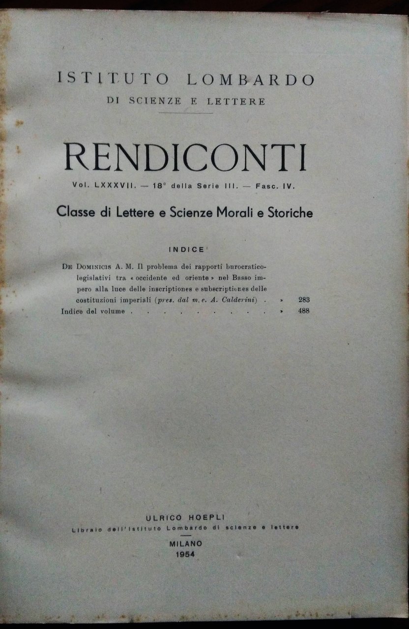 IN "Rendiconti Dell'Istituto Lombardo di Scienze e Lettere. Vol.LXXXVII, - 18° della Serie III. - Fasc. IV. Classe di Lettere e Scienze Morali e Storiche", Milano, Hoepli, 1954 8°, pp. 329-487, 7 carte-grafici ripiegate, brossura editoriale. Bella copia. Numero pressochè monografico dei Rendiconti.