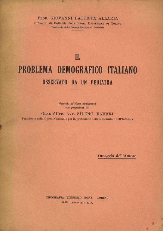 Il problema demografico italiano osservato da un pediatra. Seconda edizione aggiornata con prefazione del Grand'Uff. Avv. Sileno Fabbri.