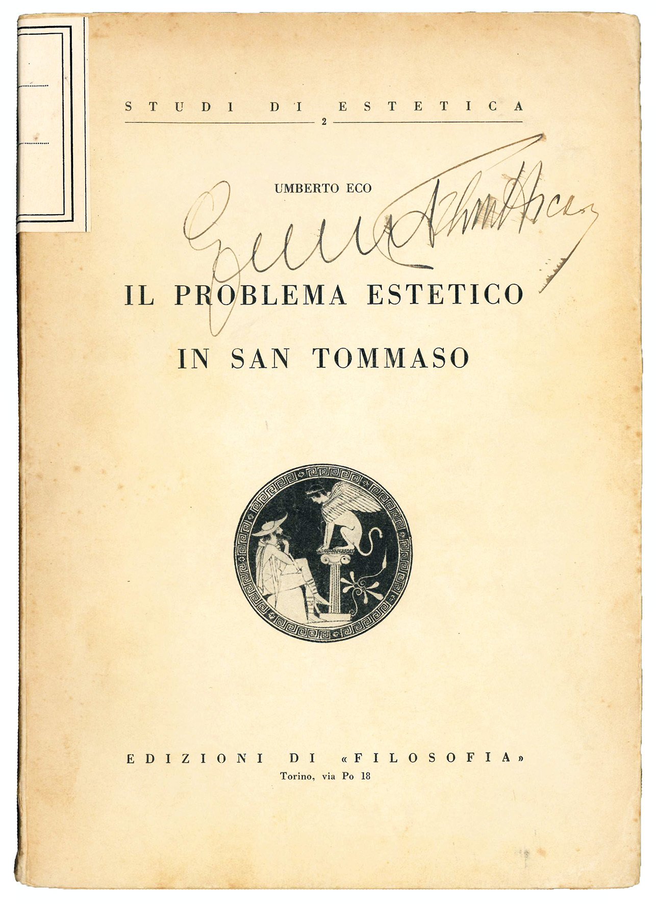 First edition of the first book by the famous Italian semiotician and novelist Umberto Eco. Il problema estetico in San Tommaso consists of an enlargement of Eco's thesis developed with the historian and philosopher Luigi Pareyson (1918-1981) on the theme of the complex and original aesthetic theories advanced by the influential medieval thinker Thomas Aquinas (1225-1274).