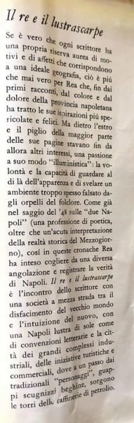 Il re e il lustrascarpe è l'incontro dello scrittore con una società a mezza strada tra il disfacimento del vecchio mondo e l'intuizione del nuovo, con una Napoli lustra di sole come di convenzioni letterarie e la città dei grandi complessi industriali, delle iniziative turistiche e commerciali, dove a un passo dai tradizionali "personaggi", guappi scugnizzi beghine, sorgono le torri delle raffinerie di petrolio.