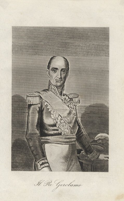 Il Re Gerolamo. (Ritratto in età matura: in piedi, a mezza figura, vòlto di 3/4 verso destra, in uniforme da Contrammiraglio della Marina Imperiale, colla mano sinistra appoggiata su un tavolino, accanto a bicorno).