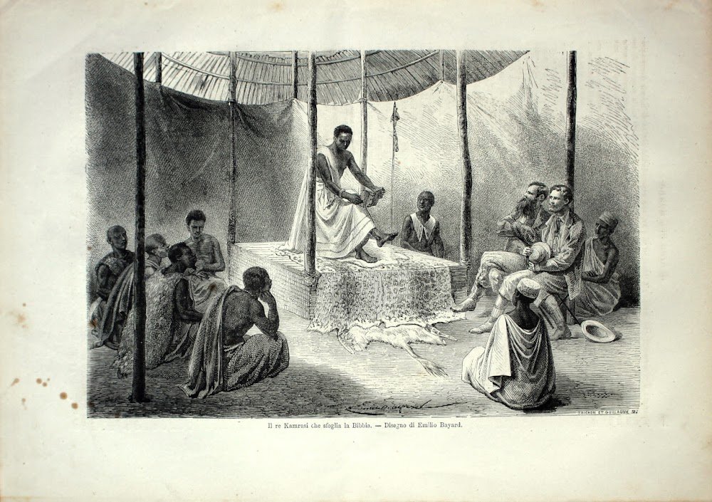 Il re Kamrasi che sfoglia la Bibbia (sped. Speke). Stampa 1864