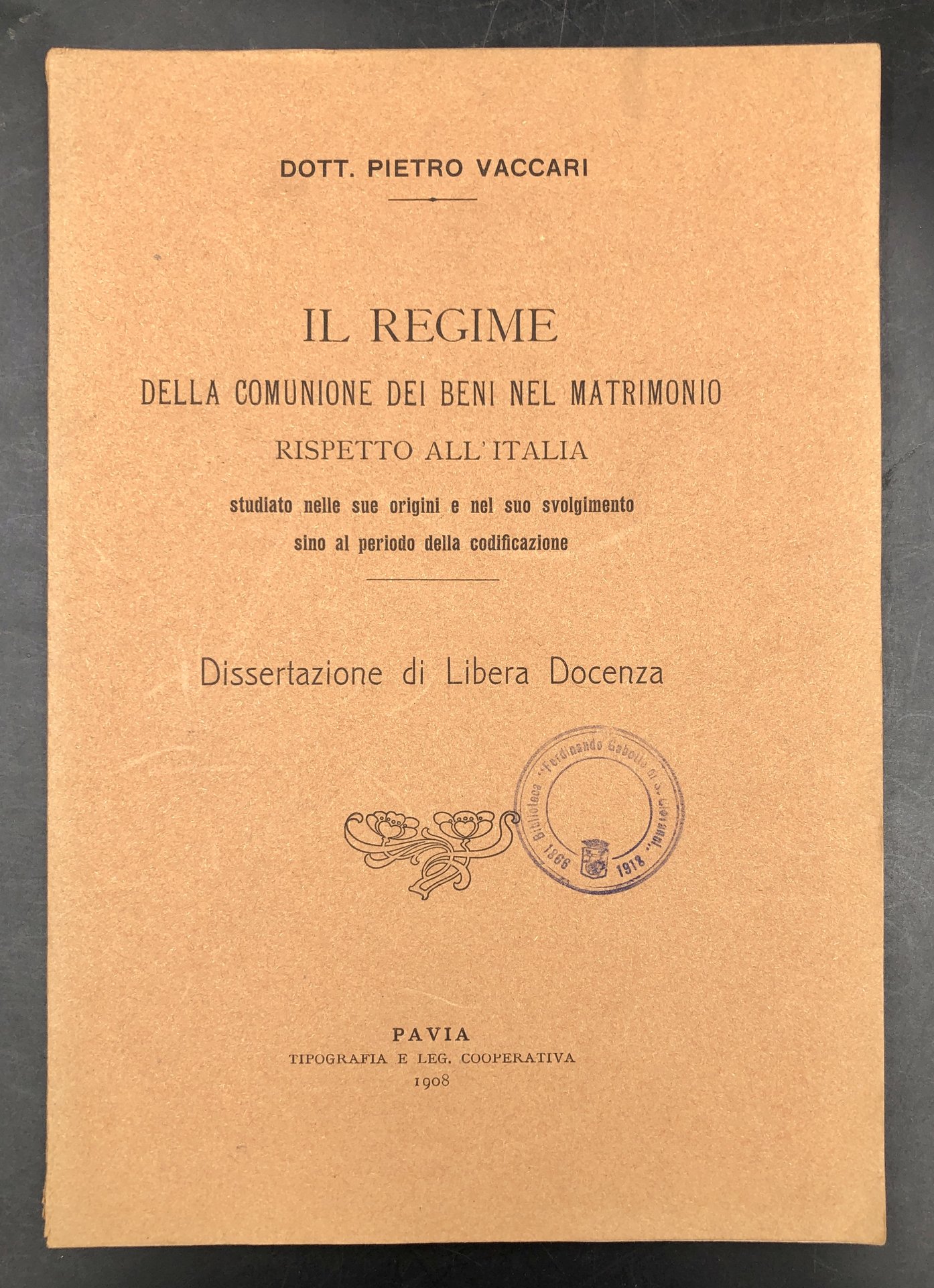 In-8° (cm. 24, pp. 108. Bross. edit. Timbro Gabotto in cop. VACCARI, prof. di storia del diritto italiano nell'univ. di Pavia dal 1924 al 1950. Sindaco e podestà di Pavia dal 1923 al 1933 (Treccani).