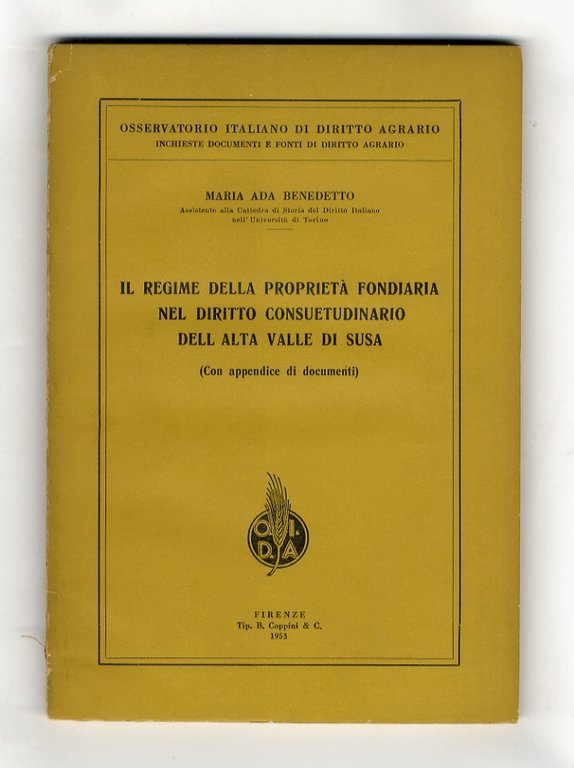 Firenze, B. Coppini, 1953, in-8, brossura editoriale, pp. 131. A cura dell'Osservatorio Italiano di Diritto Agrario. Piccoli difetti al dorso; l'interno ottimo.