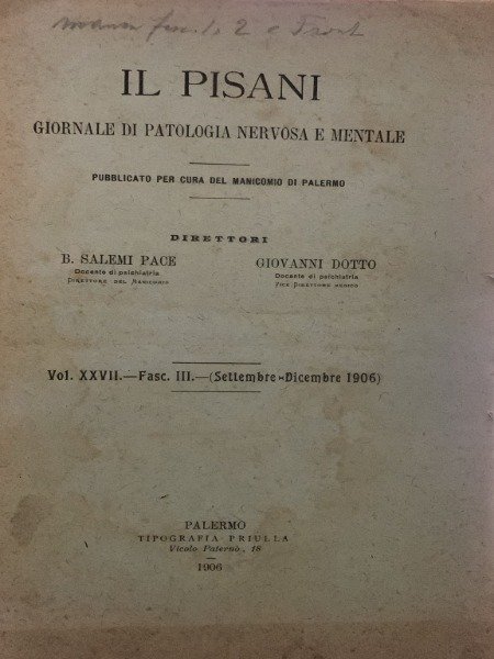 <p>CODICE 413 SCATOLA 19</p>, , <p>IL PISANI GIORNALE DI PATOLOGIA NERVOSA E MENTALE SALEMI PACE GIOVANNI BOTTO</p>, , <p>PALERMO TIPOGRAFIA PRIULLA 1906 </p>, , <p>CONTRIBUTO ALLO STUDIO DELLE NEVROSI TRAUMATICHE GIOVANNI NOERA MANICOMIO DI PALERMO</p>, , <p>OSPEDALE CIVICO DI PALERMO ISTERIA TRAUMATICA DOTT EMERICO LUNA </p>, , <p>IL RICAMBIO MATERIALE NELLA DEMENZA PRECOCE DOTT DOMENICO MASSARO</p>, , <p>MANICOMIO DI PALERMO RAPPORTO PERIZIA MEDICO LEGALE IN PERSONA DI S.LUIGI DEL FU VINCENZO DI ANNI 65 DA PALERMO IMPUTATO DI VIOLENZA CARNALE VERSO P.GIUSEPPA DI FRANCESCO DI ANNI 15 CONTRIBUTO AL VALORE DIAGNOSTICO DEL RIFLESSO BULBO-CAVERNOSO DI ONANOFF PER IL DOTT GIOVANNI NOERA ETC,</p>,