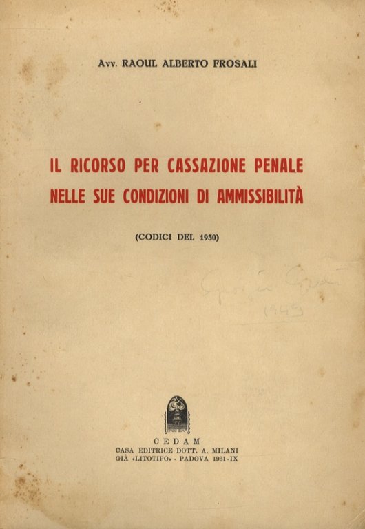 Il ricorso per Cassazione penale nelle sue condizioni di ammissibilità. (Codici del 1930).