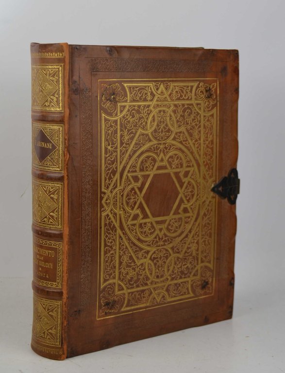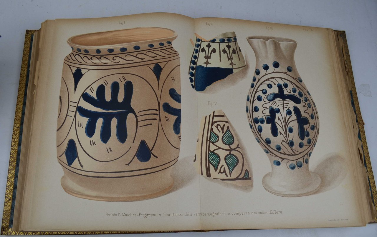 Due parti in un volume di cm. 32, pp. (8) 327 (7). Con 4 tavole in tinta nel primo volume e 40 ripiegate in cromolitografia nel secondo che contengono la raffigurazione di 193 immagini di stoviglie disegnate dall'autore. Bella legatura edit. in piena pelle, dorso a nervi. Dorso e piatti interamente decorati in oro. Fermaglio metallico di chiusura con laccio in pelle (spezzato, ma presente). Minime bruniture marginali, peraltro esemplare genuino e ben conservato. Edizione originale di questa celebre ed importante opera sulle ceramiche del centro Italia. Non comune e stampato in 500 esemplari numerati (ns. n. 293).
