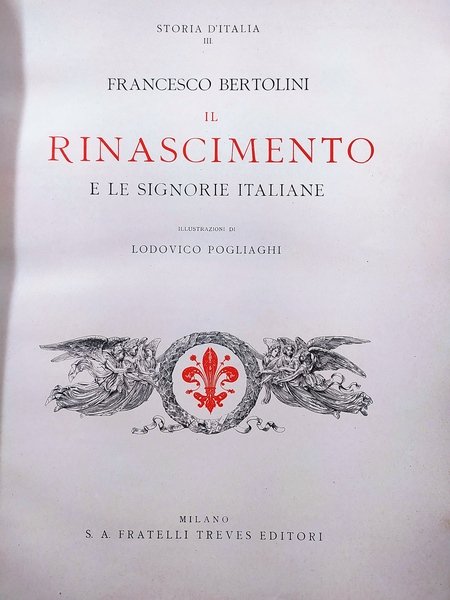 in Folio mezza pelle edit. con angoli (qc. spellat. al dorso), pp. VIII-575, con numerose belle incisioni di Lodovico Pogliaghi. "Storia d'Italia III". Buon esempl.