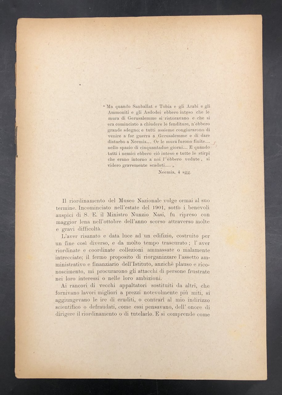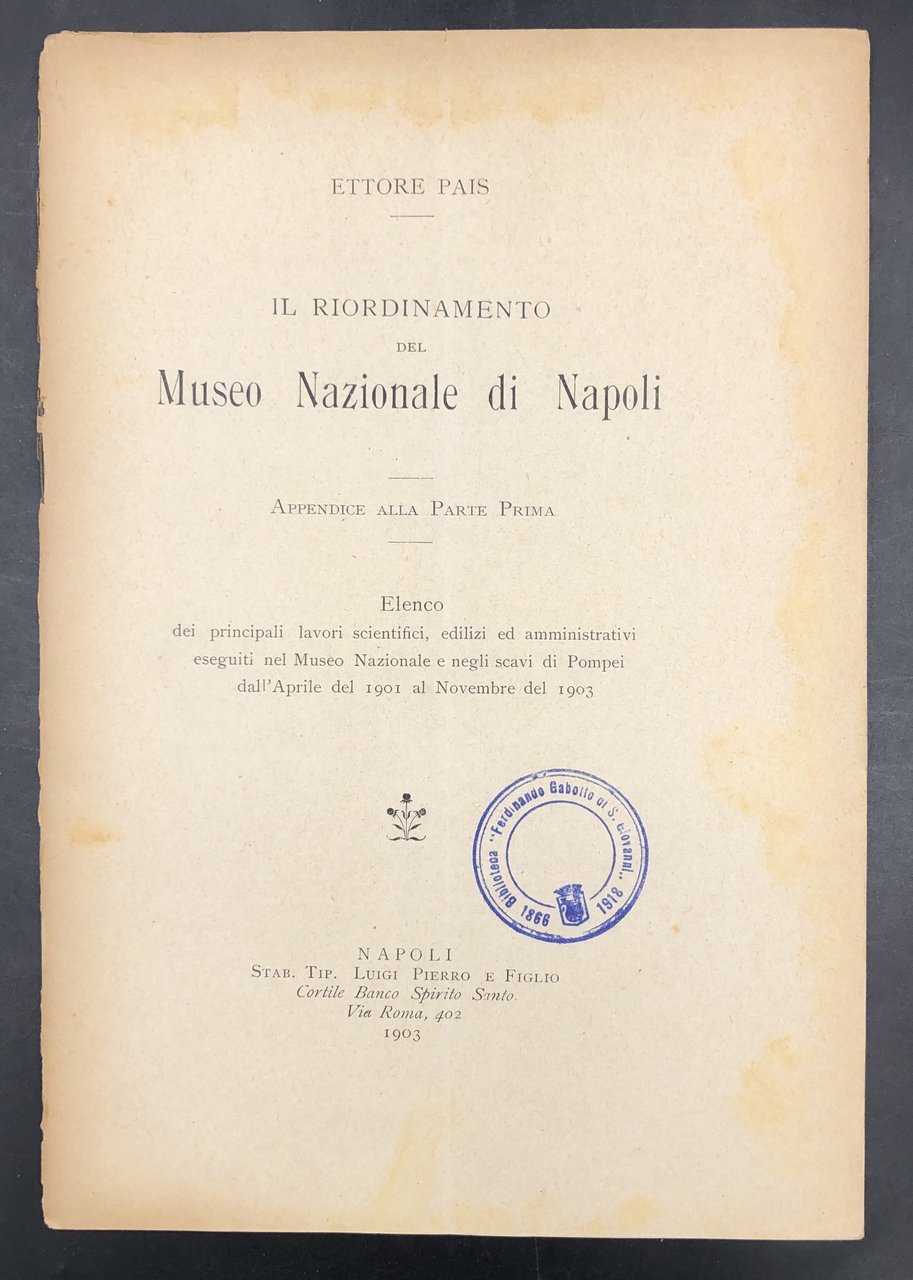 3 fasc. in-8°, pp. 30 + pp. 22 + pp. 19, autocopertinati. Fasc. edit. a graffe. Il 3° fasc. ha i piatti sataccati. Timbri Gabotto alle copp. . 1) Parte prima. Il memoriale della R. Accademia. 2) fasc. 2° della parte prima. "Le insinuazioni e le calunnie dei denigratori. 3) Appendice alla Parte Prima: "Elenco dei principali lavori scientifici, edilizi ed amministrativi eseguiti nel Museo". Il Museo archeologico nazionale di Napoli (MANN) è considerato uno dei più importanti musei archeologici al mondo, il primo per l'arte romana (Collezione Farnese), fondamentale per la pompeiana, e il 3° per l'egizia. Ettore PAIS, direttore da marzo 1901 a giugno 1904,[15] lo realizzò esponendosi ad aspre critiche per i criteri adottati, giudicati rivoluzionari. Ciò non impedì che tutto venisse rimosso e risistemato nel giro di due anni; così rimase per 90 anni e ancora condiziona un riallestimento adeguato a criteri aggiornati. Il lotto dei 3 opuscoli
