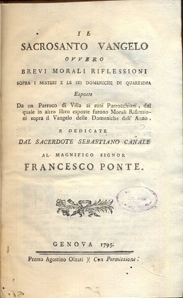 Il Sacrosanto Vangelo ovvero brevi morali riflessioni sopra i misteri e le sei domeniche di quaresima.