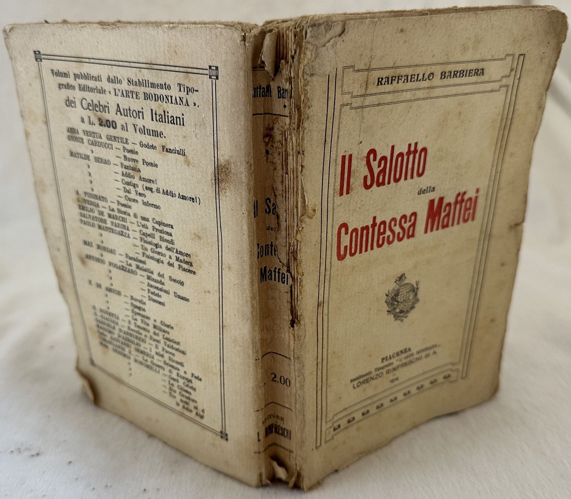 Edizione del 1914 di questa monografia sul salotto della Contessa Maffei (1814-1886) di Raffaello Barbiera. Il salotto della Contessa Clara Maffei in via dei tre monasteri a Milano ospitava regolarmente scrittori, musicisti ed altri come Giuseppe Verdi, Giovanni Prati, Francisco Hayez ec. All'interno: I fodnatori del salotto, Balzac, Liszt, Milano prima del 1848, Shakespeare, Giovanni Prati Niccolini e Giusti, Il salotto d'Adda e altri salotti patriottici, Dopo il '59, Manzoni e Verdi ec. In discrete condizioni. Copertina editoriale in buone condizioni con lievi usure ai margini e dorso. Legatura in discrete condizioni con leggere rotture. All'interno le pagine si presentano in buone condizioni con rare fioriture. In 8. 19,5x13 cm. Pp. 303+(1).Edition of 1914 of this monography about the salon hosted by Contessa Maffei (1814-1886) by Raffaello Barbiera. IThe salon of Contessa Clara Maffei in via dei tre monasteri in Milan hosted regularly writers, musicans and others as Giuseppe Verdi, Giovanni Prati, Francisco Hayez ec. All'interno: I fodnatori del salotto, Balzac, Liszt, Milano prima del 1848, Shakespeare, Giovanni Prati Niccolini e Giusti, Il salotto d'Adda e altri salotti patriottici, Dopo il '59, Manzoni e Verdi ec. In fair conditions. Editorial cover in good conditions lightly worn in the extremities. Binding in fair conditions with light cracks. Inside pages are in good conditions with occasional foxing. In 8. 19,5x13 cm. Pp. 303+(1).