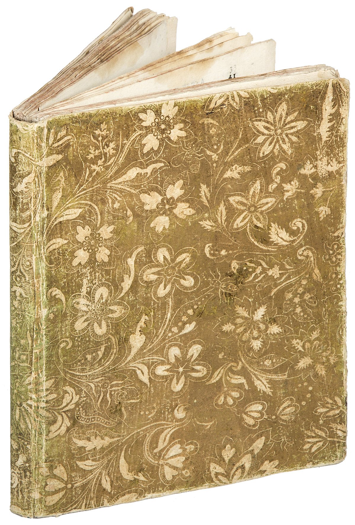 In 4to (mm. 217x160). Pp. [12, incluso il frontespizio inciso], 162, [2]. Con 5 tavole calcografiche ripiegate fuori testo. Segnatura: a6 A-V4 X2. Il frontespizio e le tavole sono incise da Jacques Callot su disegni di Giulio Parigi. Il frontespizio, che rappresenta il protagonista in piedi tra vari trofei, è qui nel secondo stato con l'iscrizione sotto lo stemma mediceo e la firma dell'incisore in basso a sinistra (cfr. G. Boffitto, Per un frontespizio del Callot, in:” La Bibliofilia”, XXX, 1928, p. 6). Le tavole rappresentano scene tratte dai cinque atti della tragedia ed ambientate nella Firenze dell'epoca. Frontalini, finalini, iniziali e fregi xilografici. Cartonato coevo ricoperto di bella carta colorata, tagli rossi (un po' sbiaditi). Piccoli fori di tarlo nelle prime carte con minimi danni al testo, sporadici aloni e macchie marginali. Ottima copia.
