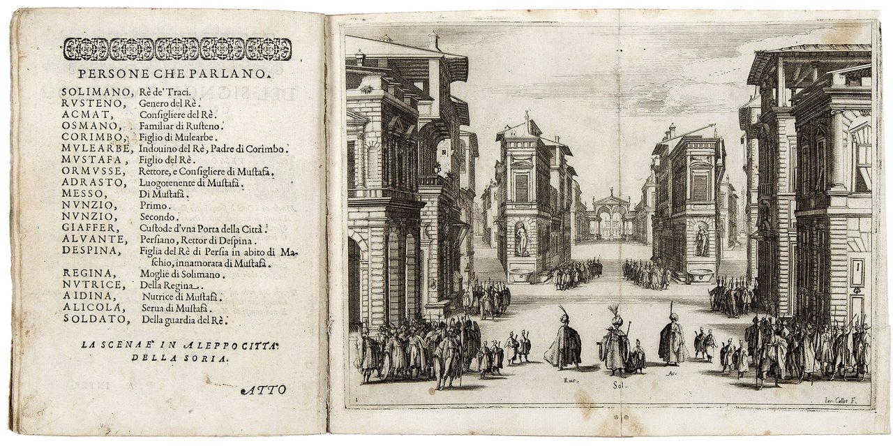 PRIMA EDIZIONE ILLUSTRATA di questa fortunata tragedia in cinque atti in versi di ambientazione turchesca, che tra il 1619 e il 1658 andò incontro a numerose edizioni. Rappresentata per la prima volta ad Ancona nel 1618, fu pubblicata a Venezia l'anno seguente in un'edizione in 12mo senza illustrazioni. Preceduta da una lettera di G.B. Strozzi all'autore, da sonetti laudatori di Ottavio Rinuccini, Andrea Salvadori, Niccolo Strozzi e Gabriello Chiabrera. Con questa tragedia sono introdotte importanti innovazioni come l'abolizione del prologo e del coro. Per l'ambientazione, gli usi e i costumi dei Turchi il Bonarelli si rifece alle Istorie dei Turchi di Francesco Sansovino (cfr. R. Ciancarelli, Introduzione, in: “P. Bonarelli, Il Solimano: strategie teatrali di un dilettante nel Seicento”, Roma, 1992).