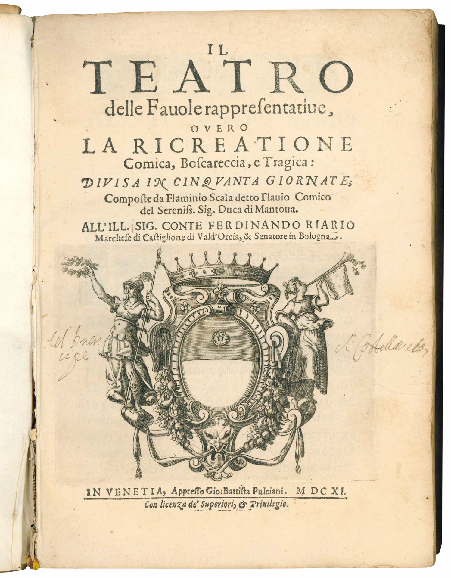 “Nel 1611, sotto la protezione di Vincenzo I Gonzaga, vide la luce Il teatro delle favole rappresentative, prima e unica raccolta di scenari edita da un comico dell'Arte la cui premessa portava la firma di Francesco Andreini (Capitan Spavento da Vall'Inferna). Conducendo il lettore dentro l'officina creativa dei comici italiani i cinquanta scenari, suddivisi in altrettante giornate in riferimento alla tradizione novellistica, offrivano in lettura fabulae ricche di informazioni circa le azioni, i lazzi, gli effetti scenotecnici, le ‘robbe' di scena. Momento più alto di un'operazione ideologica improntata alla ricerca dei valori specifici della commedia all'improvviso, la pubblicazione del Teatro delle favole rappresentative –opera destinata da Scala a una doppia fruizione, dotta e tecnico-pratica– stabilì l'inizio di una nuova tradizione drammaturgica d'attore, autonoma da quella letteraria, e, ‘tracciando la linea di demarcazione fra due culture, quella del teatro da leggere e quella del teatro da recitare, assegnava alla seconda il compito di trasmettere il sapere degli attori come valore autonomo' (S. Ferrone, La Commedia dell'Arte. Attrici e attori italiani in Europa (XVI-XVIII sec.), Torino 2014, p. 97). Completata da una dedicatoria al conte Ferdinando Riario, da una nota dell'autore, da nove sonetti di vari personaggi, la raccolta gettava inoltre le basi per la costruzione del mito dell'Improvvisa e delle grandi compagnie: come in un immaginario all stars show riuniva infatti sulla carta i migliori interpreti delle prime due generazioni dell'Arte, da Francesco e Isabella Andreini a Giovanni Pellesini (Pedrolino) fino all'Arlecchino Martinelli, di cui gli scenari, suddivisi tra commedie – ben quaranta –, favole pastorali, opere regie e tragedie, attestavano l'ampiezza del reperto