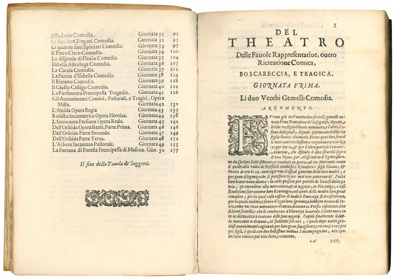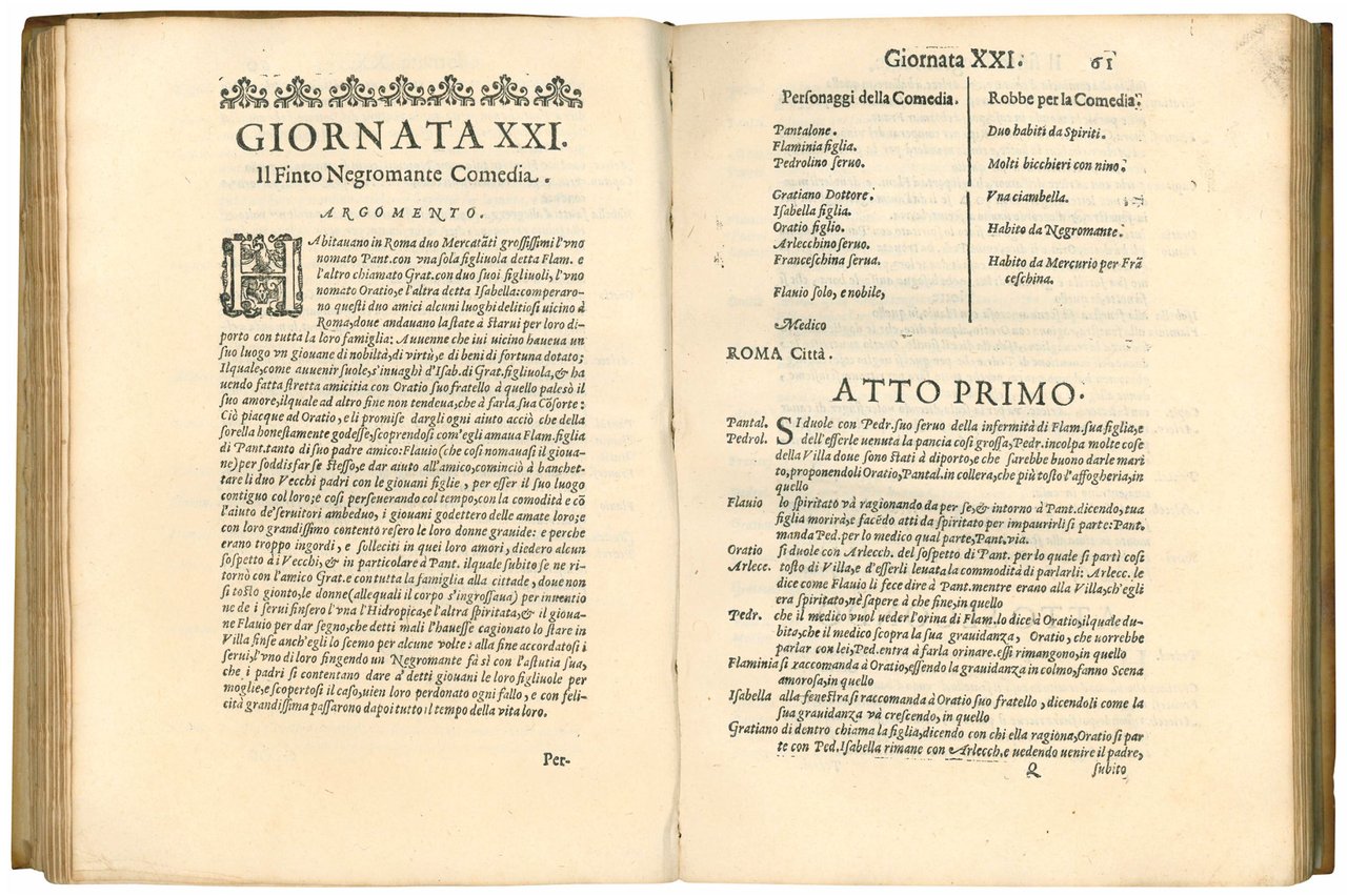 Prima edizione di questa opera capitale per la conoscenza della Commedia dell'Arte. Si tratta infatti della più ricca raccolta a stampa di scenari teatrali, che, concepiti per la recitazione “a soggetto”, costituivano il canovaccio sul quale gli attori eseguivano le loro improvvisazioni e variazioni recitative.