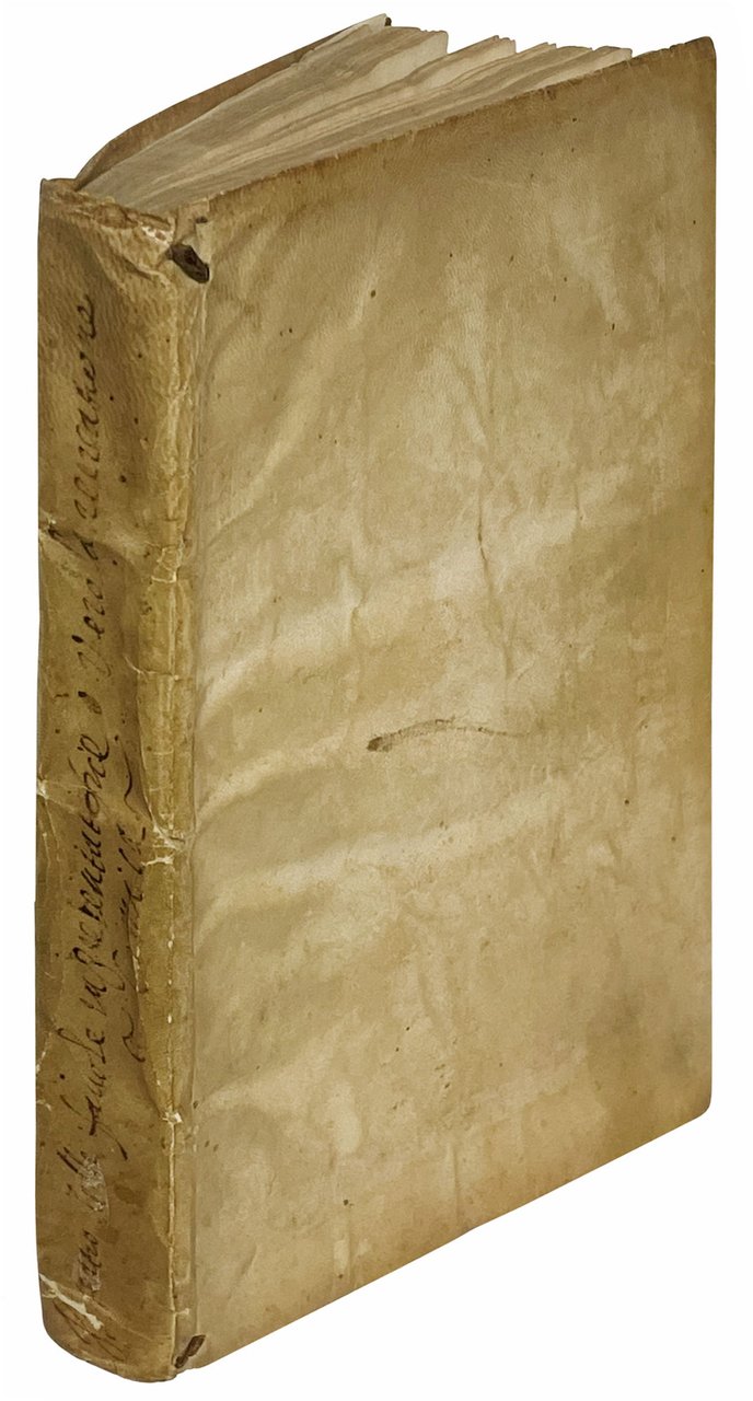 4to (mm. 220x158). Cc. [8], 160. Segnatura: a-b4 A-Rr4. Sul titolo grande stemma calcografico del dedicatario dell'opera, il conte Ferdinando Riario, marchese di Castiglione di Val d'Orcia. Pergamena floscia coeva con titolo manoscritto lungo il dorso (un po' sporca, piccolo restauro marginale al piatto anteriore). Al titolo firma di possesso “del Prencipe di Castellaneta”. A tratti leggermente brunito, mancanza all'angolo inferiore esterno della c. 53 senza perdita, segno di tarlo nell'angolo inferiore bianco di alcune carte abilmente restaurato senza danno al testo, nel complesso ottima copia genuina.