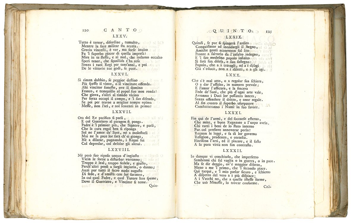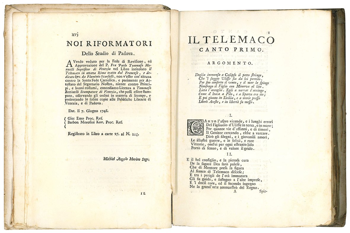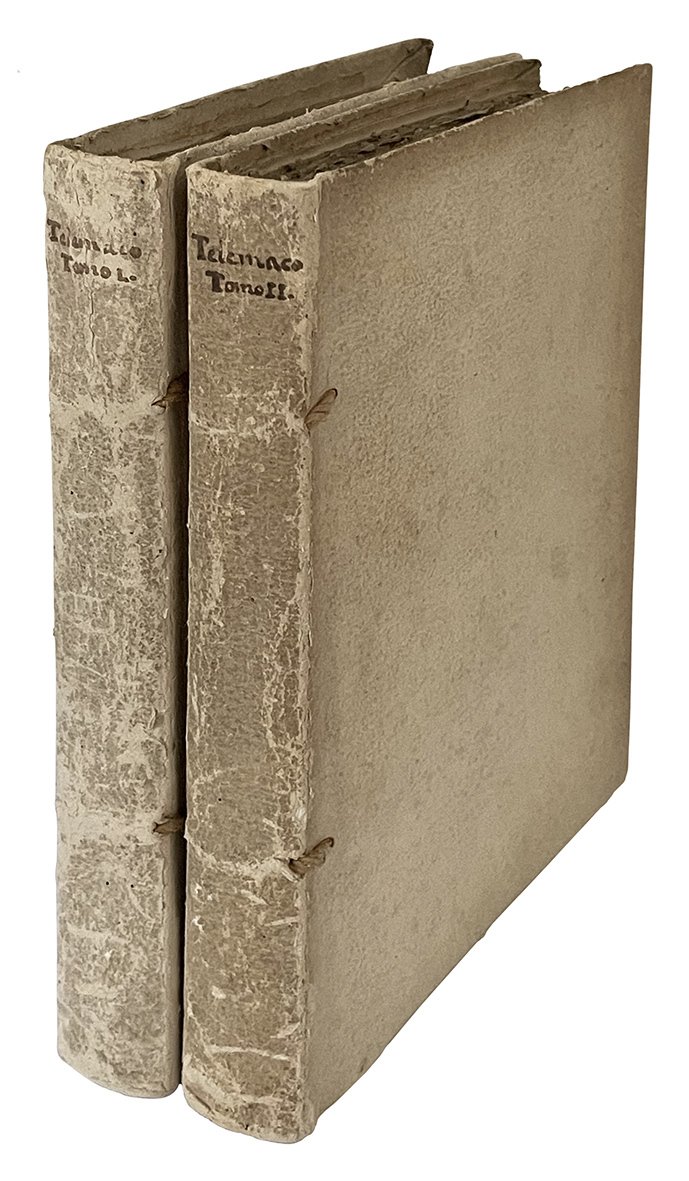 Two volumes, 8vo (205x150 mm). XVI (including the frontispiece engraved by G. Cattini), 305, [3 blank]; 340 pp. Title page of volume 1 printed in red and black with engraved vignette in the center. Contemporary boards “alla rustica”, inked title on spine. First volume a bit loose. A very good copy, uncut with deckle edges. First edition of Fénelon's Les Aventures de Télémaque in the Italian verse translation by Flaminio Scarselli, first printed in Rome in 1747. Italian Union Catalogue, IT\ICCU\TO0E\036840.