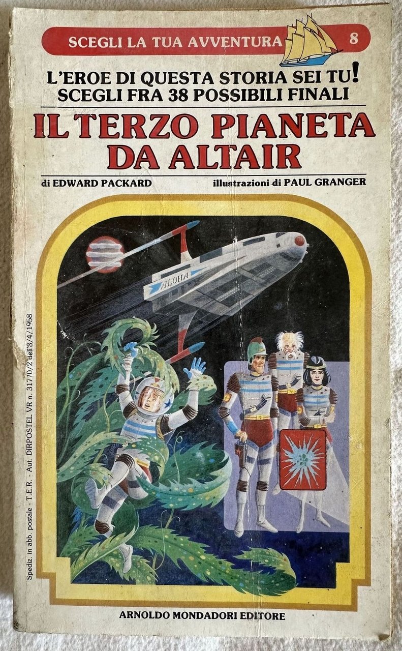 Edizione del 1897 di questo romanzo di avventura nello spazio di Edward Packard della collana "Scegli la tua avventura". All'interno illustrazioni di Paul Granger. In buone condizioni. Brossura editoriale in buone condizioni generali con lievi usure ai margini e dorso. Piatto anteriore in parte staccato. Legatura in buone condizioni. All'interno le pagine si presentano in buone condizioni con rare fioriture. In 16. Dim. 17,5x10,5 cm. Pp. 108.Edition of 1897 of this novel of adventures in the space written by Edward Packard of the series "Scegli la tua avventura". Inside illustrations by Paul Granger. In good conditions. Editorial cover in good general conditions lightly worn in the edges and spine. Front plate partially detached. Binding in good conditions. Inside pages are in good conditions with occasional foxing. In 16. Dim. 17,5x10,5 cm. Pp. 108.