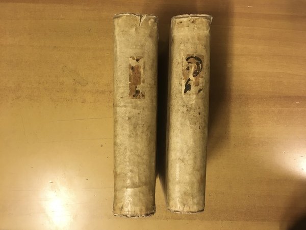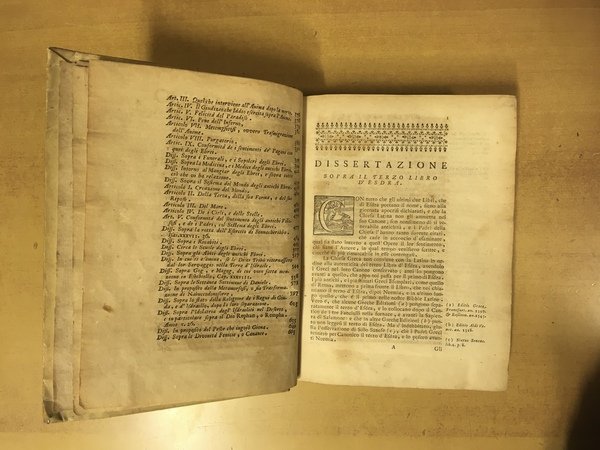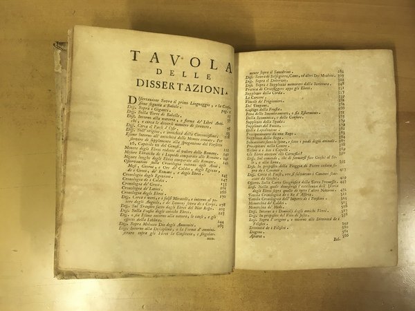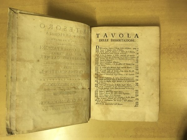 2 voll. in 4, [mm. 217 x 165], pp. (6) – 706 – (2); (4) – 684.In pergamena liscia con tagli spruzzati. Lievi danni alle cuffie, labbro del piatto posteriore strappato ed angoli consunti al I tomo. Testate, capolettera e finali incisi in legno.Esemplari a margini ampi con bruniture diffuse dovute al tipo di carta.Sottile lavoro di tarlo all’angolo inferiore bianco del I vol. che inizia a p. 3 e si restringe fino a scomparire a p. 43, altro che interessa il margine bianco, molto sotto il testo, iniziando da p. 441 per terminare a p. 523. Qualche macchia al margine esterno delle ultime carte.Piccolo strappetto a p. 53 del II volume che ha un lavoro di tarlo al margine bianco inferiore delle pagine da 351 fino a 410 assai lontano dalla scrittura. Altro da p. 479 fino alla carta di guardia posteriore, vicino alla legatura. Mancante purtroppo delle pp. 451-454 (Lll2ed Lll3). Qualche sporadico alone ai margini bianchi, assai più evidenti alle carte di guardia ed ai risguardi.Al frontespizio del I volume nota di possesso manoscritta: “alla libb[reri]a de Cap[ucci]di di Nola” ripetuta nella forma “App[ar]t[iene] alla libb[reri]a de Cap[ucci]ni di Nola”. Ai risguardi posteriori grande numero 55 realizzato con timbro ad inchiostro.Si tratta di uno degli eruditi saggi scritti dal padre benedettino Augustin Calmet, che vide traduzioni in inglese, olandese, tedesco e che fu tradotto in italiano da Lamberto Gaetano Ponsampieri, nobile lucchese che dedica l’opera al cardinale Antonio Banchieri, pistoiese e nipote di Clemente IX. Tra le dissertazioni a metà fra antiquaria ed erudizione del Calmet (1672-757) che era anche autore di un curioso trattato apparso nel 1746 dal titolo Dissertations sur les apparitions des anges, des demons & des esprits. Et sut les reuenans et vampires. De Hongrie, de Boheme, de Morauie & de Silefie in cui ammetteva l’esistenza dei vampiri. Tra le dissertazioni vale la pena di citare “Sovra il primo Linguaggio, e la confusione seguita a Babele”, “Sopra Molocco Dio degli Ammoniti”, Gli Ebrei avevan’elli Carnefici”, “Sopra la malattia di Giobbe”.