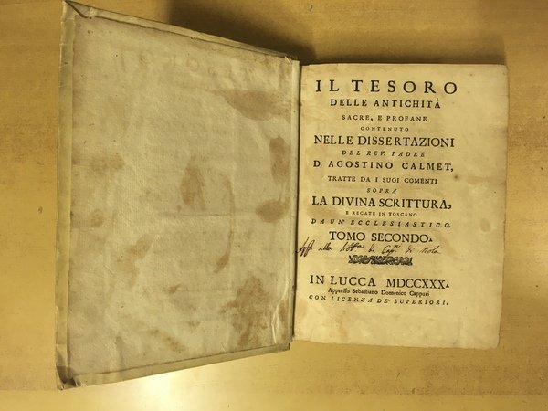 Il Tesoro delle Antichità sagre, e profane contenuto nelle Dissertazioni del Rev. Padre D. Agostino Calmet tratte da’ suoi comenti [sic] sopra la Divina Scrittura e recate in toscano da un’Ecclesiastico. In Lucca, Appresso Sebastiano Domenico Cappuri, 1729.