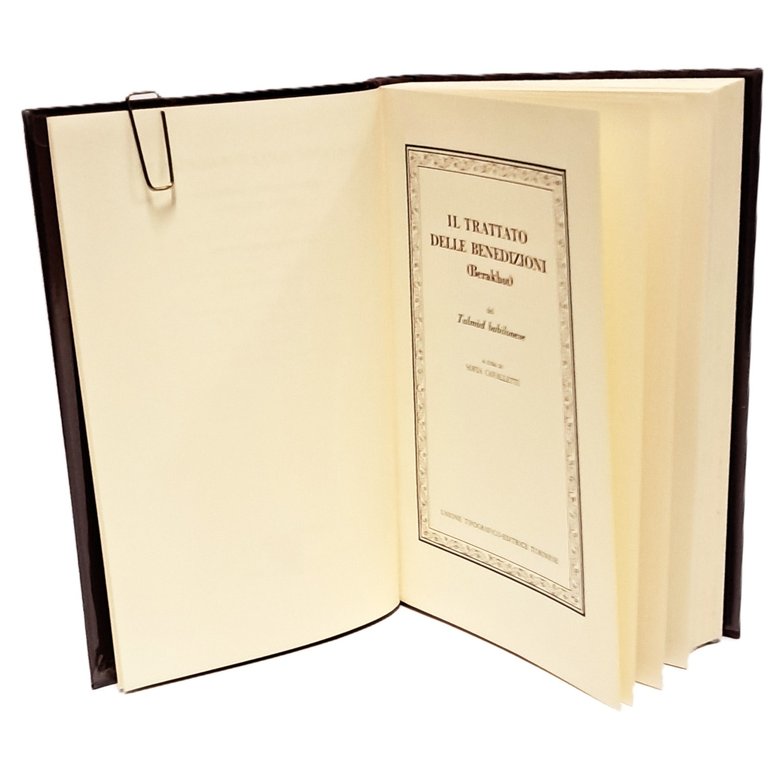 PRIMA EDIZIONE, collana Classici delle religioni sezione seconda diretta da Piero Rossano, La religione ebraica Traduzione del Trattato delle benedizioni (Berakhot) dovuta a Eugenio Zolli; la redazione del testo si ritiene conclusa entro il VI secolo ed è opera delle scuole rabbiniche di Babilonia. Il testo è preceduto da una introduzione alla letteratura talmudica. Cartonato. Pp. 474. Con 8 tavole fuori testo. Ottime condizioni.