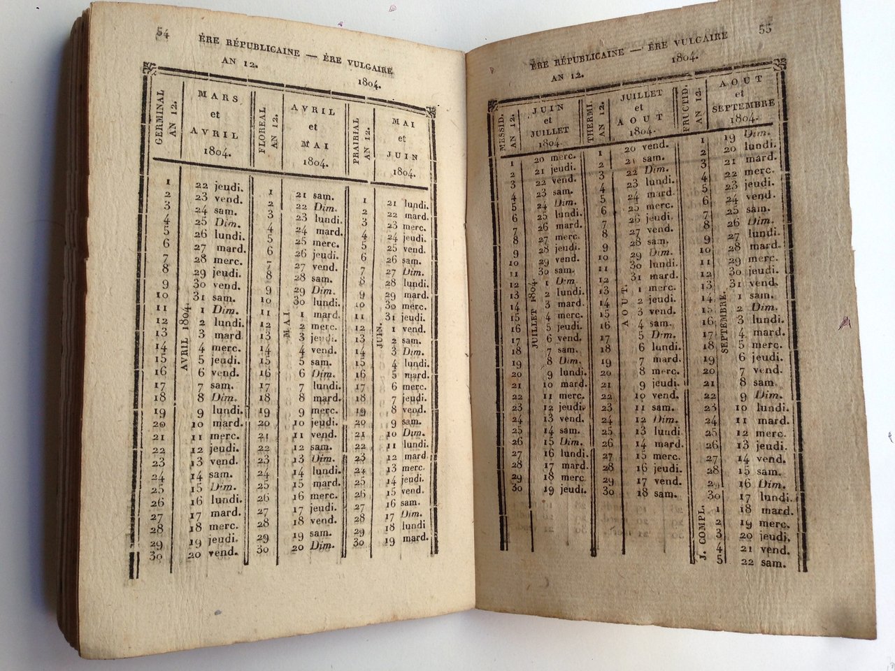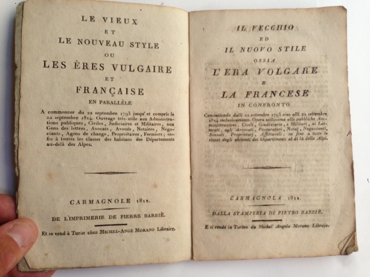 In-8° piccolo, pp. 93, cartonatura muta dell'epoca. Testo in bilingue francese e italiano. Utilissimo 'calendario', recante la concordanza tra le date e le denominazioni dei mesi del periodo rivoluzionario e napoleonico con quelle dell'era 'volgare', testo indispensabile per l'epoca, ma anche oggi per la datazione di tanti documenti, decreti e testi ufficiali di quegli anni che sovente recavano solo le date del nuovo calendario. Quasi profeticamente le tavole di concordanza si arrestano al settembre del 1814.