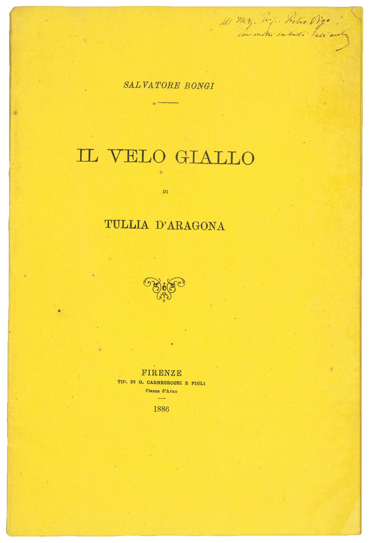 Si tratta di un estratto dalla “Rivista critica della letteratura italiana” (a. III, n. 3, marzo 1886) stampato su carta giallo canarino, evidentemente come copia di dono, che contiene la ricostruzione di un episodio della vita di Tullia D'Aragona, che poi confluirà anche nei celebri Annali di Gabriel Giolito de' Ferrari che l'autore pubblicherà a Roma nel 1890. Durante un soggiorno fiorentino nel 1546 Tullia fu costretta dalle autorità a portare il velo giallo imposto alle cortigiane dalle leggi suntuarie della città. L'ordinanza, tuttavia, fu da lì a poco annullata anche grazie ad una supplica della stessa Tullia al granduca Cosimo I, al quale ella dedicherà poco dopo il suo Dialogo dell'infinità d'amore pubblicato nel 1547.