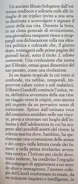 Un anziano libraio bolognese dall'esistenza mediocre e solitaria cede alle lusinghe di un triplice invito a una serata destinata a sconvolgere e segnare il corso della sua vita. Durante la festa, in un clima generale di revisionismo, una giornalista rampante riesce a strappargli una dichiarazione sulla sua identità politica e culturale che, il giorno dopo, troneggerà sulle prime pagine dei giornali locali, sotto il titolo: L'ultimo comunista. Una confessione che suona per il libraio, ormai quasi dimentico del suo passato, come una rivelazione. In un marzo tropicale in cui tutto si confonde, tra nebbie, temporali, improvvise calure estive e soli malaticci, il libraio Gandolfi comincia l'unica, vera, definitiva avventura della sua vita: un viaggio verso le origini, reso ancora più urgente da un pervasivo senso di estinzione. Spinto dall'ostinata voce del comunista annidato nelle sue viscere, prova a ritornare nei luoghi dell'infanzia e dell'adolescenza in cui ha scoperto altri possibili assetti del vivere: la colonia marina dove, bambino, ha sperimentato una «comunione delle anime e dei corpi» nella lettura corale dei fumetti e nella prima rivelatrice avventura erotica; l'Istituto per ciechi dove, unico vedente, ha condiviso l'orgoglio dei compagni di appartenere a un mondo altro e immaginoso; l'austero collegio del Cionfi trasformato in estate, da un istitutore inquieto e intelligente, in un abbozzo di falansterio. Un ritorno a luoghi, memorie, brandelli di esperienze, che è come una condanna a morte. Quel mondo ha subito una straziante, grottesca mutazione, e il Gandolfi si ritrova a vagare tra gulliveriane discoteche-condom e sexy shop fantasmagorici in cui dilaga un'anonima e disperata vitalità. Un pianeta sconosciuto dove il protagonista finisce per aggirarsi come uno straniero in terra straniera, ospite inetto e sgradito.