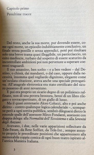 Intorno alla morte di Demetrio Gandolfi, sessantenne, librario, si sviluppa un breve giallo in cui si mescolano, come in un pasticcio gastronomico, balorde vivande: interviste televisive, errori commessi dai cronisti, coincidenze sciagurate. Ma si tace subito, su tutto. Perché è molto più interessante seguire gli ultimi giorni di vita del solitario e abitudinario personaggio, perché certe possibili spiegazioni del delitto sono lì, malamente nascoste tra indizi sicuri e tracce disseminate volutamente a caso.