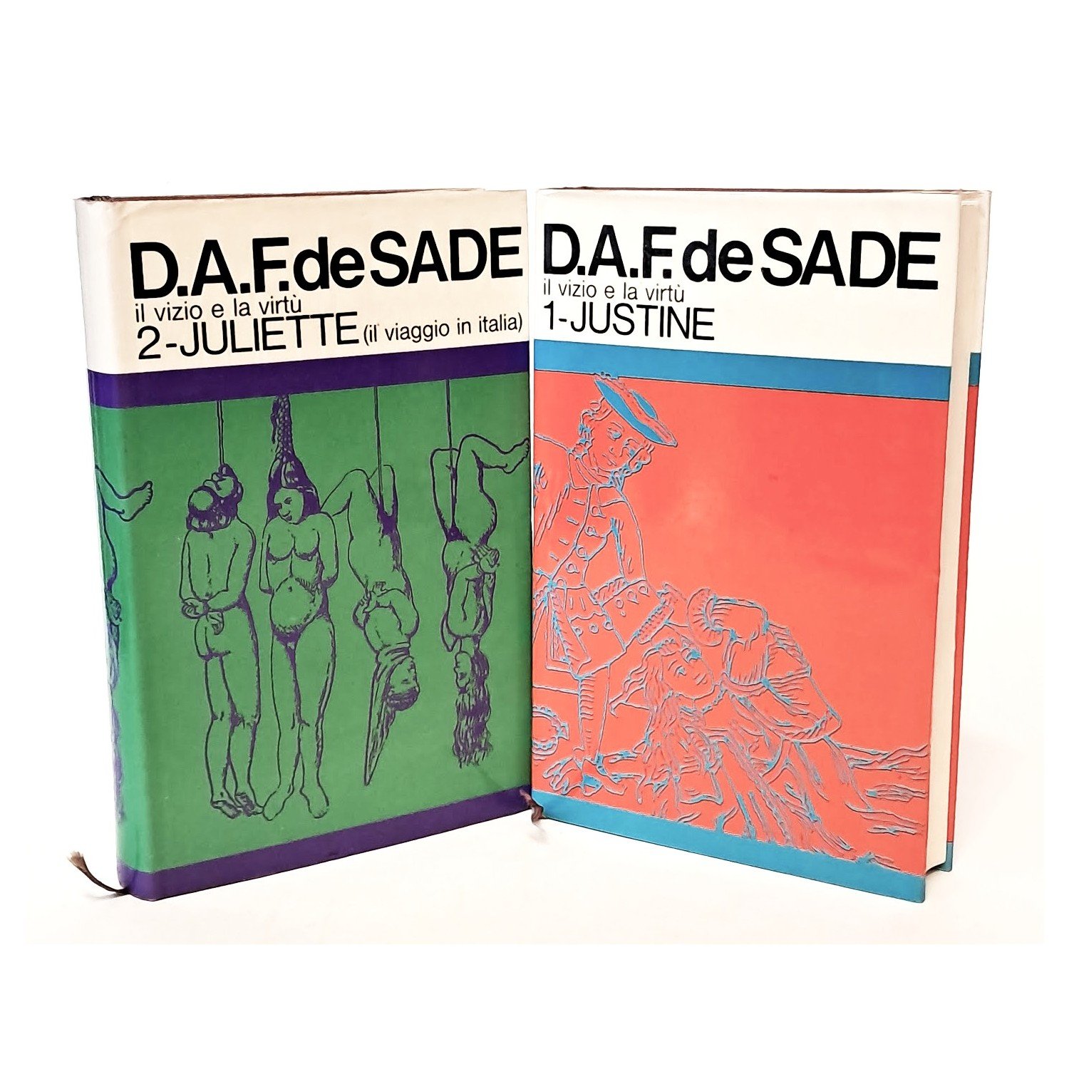 PRIMA EDIZIONE per la Nuova Editrice Milanese in 1000 esemplari numerati di cui il presente è il numero 134. Opera in due volumi corredata da uno scritto di Georges Bataille e una breve antologia della critica sadiana. Justine e Juliette, figlie adolescenti di un ricco banchiere parigino, educate in collegio, si trovano improvvisamente sole, in seguito alla rovina finanziaria della famiglia e alla morte dei genitori. Justine, fedele ai principi morali dell'educazione ricevuta, dovrà affrontare un terribile viaggio nell'inferno della Francia dell'ancien régime, tra giudici corrotti e frati libertini, aristocratici viziosi e borghesi delinquenti. Vittima di violenze e umiliazioni inaudite, la sventurata è destinata a una fine agghiacciante, mentre la sorella si è conquistata, attraverso l'accettazione del vizio, un'esistenza libera, ricca e serena. Copertina cartonate con sovraccoperta illustrata. Pp. 747. Opera edita in mille esemplari numerati di cui la presente è la numero 984. Ottime condizioni.