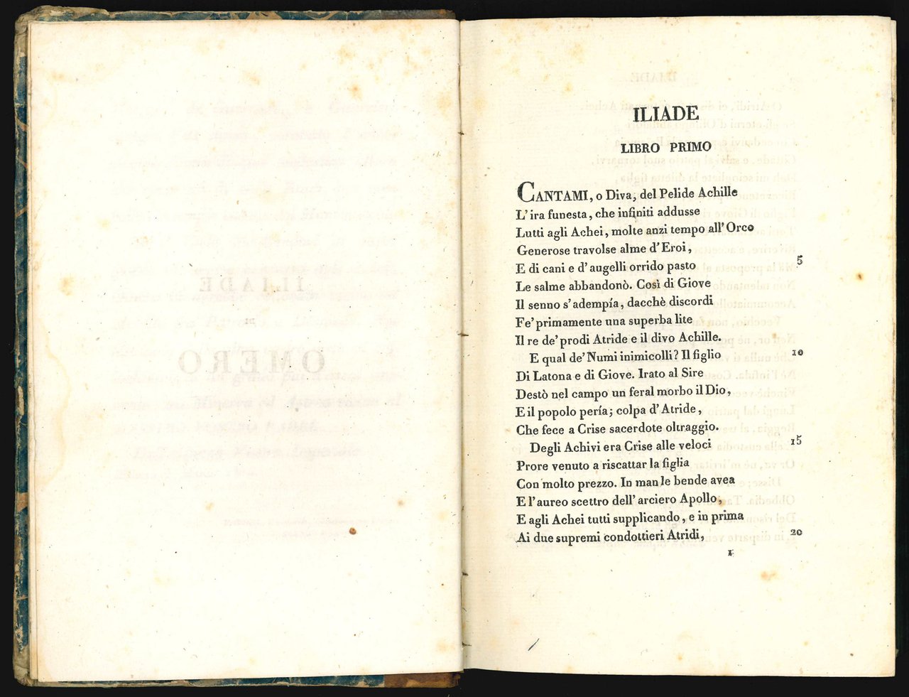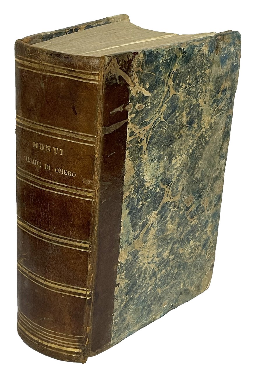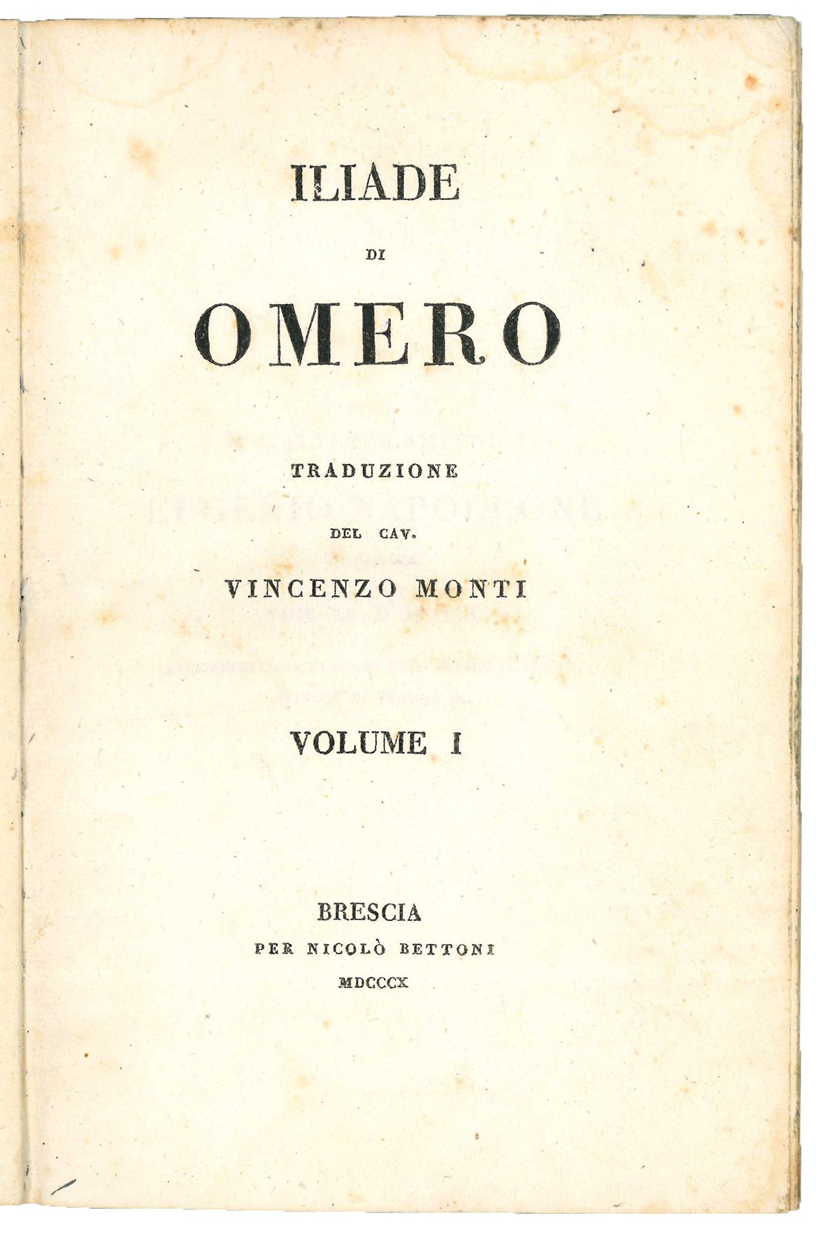 Prima edizione, dedicata al viceré d'Italia, Eugenio Beauharnais, della celebre traduzione dell'Iliade di Vincenzo Monti, che per la sua diffusione rappresenta uno dei più grandi successi editoriali degli ultimi due secoli. Su di essa si formarono generazioni di studenti fino alla metà del Novecento, tanto che il testo omerico rimase a lungo inseparabile dalla versione in versi del Monti. La meraviglia di questo capolavoro deriva forse paradossalmente dal fatto che Monti, ignorando il greco, non si preoccupò più di tanto dell'aderenza al testo e lasciò libero corso alle sue fortunate amplificazioni e integrazioni (cfr. A.M. Balbi, La traduzione montiana dell'Iliade, Roma, 1962, passim).