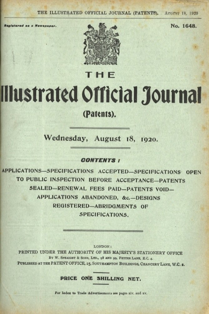 Illustrated (The) Official Journal. (Patents). Registered as a Newspaper. Contents: Applications - Specifications accepted - Specifications open to public inspections before acceptance - Patents sealed - Renewal fees paid - Patents void - Applications abandoned, &c. - Designs registered - Abridgments of specifications. NN. 1624-1628, 1630-1632, 1642, 1643, 1646-1649 (July-August) - 1650, 1651, 1653-1658 (September- October).