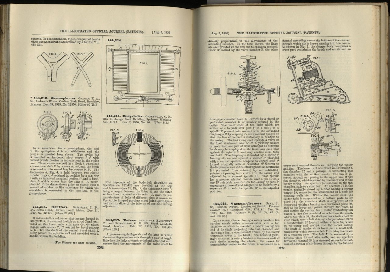 London, published at the Patent Office, 1920, fasc. 22 raccolti in 3 voll., copertine fittizie (conservate le br. editoriali), pagine da 221 a 380, da 407 a 494, da 129 a 496, da 577 a 928 - da 787 a 890, da 989 a 1174, da 1207 a 1390 - da 1919 a 2174 e da 2463 a 3314, da 3459 a 4386 intercalate con pp. a nn. romani e precedute e concluse ad ogni fascicolo da pp. pubblicitarie + supplementi (76, da 25 a 36, da 121 a 136, da 153 a 216). Con illustrazioni nel t. (relative ai brevetti, di cui è data stringata descrizione, nome dell'inventore, indirizzo, data, classificazione).