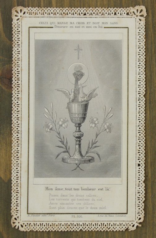 Image pieuse: MON AME, TOUT TON BONHEUR EST LA'. Lithographie, canivet, dentelle