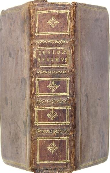 Lugduni Batavorum, chez Ioannis Maire, 1641. In/16 oblong, reliure plein veau postérieur, dos à nerfs à caissons dorés, plats avec double filets dorés, contenant trois titres : Immensa di misericordia, 143 p. Precationes quibushomines assuescant cum Deo loqui. Item precatio dominica, digesta in setem partes iuxta septem dies, eodem auctore. 136 p. Explicatio in symbolum Apostolum, & Decalogum., 264 p. Exemplaire en bon état avec un ex-libris de Mathieu Varille. Érasme, né en 1466 ou 1469 à Rotterdam et mort le 12 juillet 1536 à Bâle, humaniste et théologien néerlandais, considéré comme l’une des figures majeures de la Renaissance tardive.