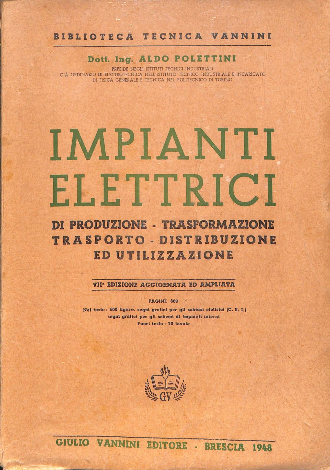 Impianti elettrici di produzione, trasformazione, trasporto, distribuzione ed utilizzazione. XV, 771 p., 20 c. di tav. : ill. ; 25 cm. Sottolineature a matita rossa su alcune pagine. 620 - Ba Ottimo (Fine)