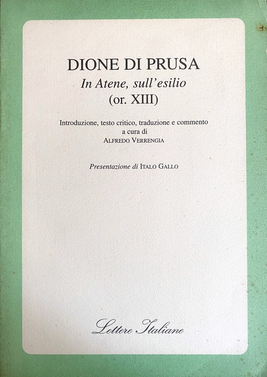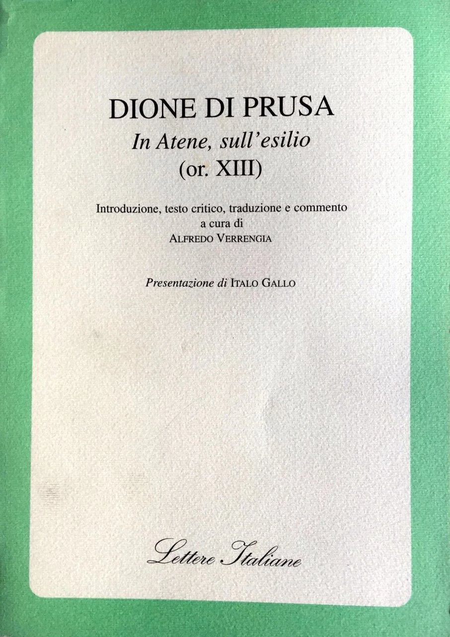 DIONE DI PRUSA (40 d.C.-110 d. C.) è uno dei più interessanti intellettuali del periodo greco-romano della letteratura greca. Già in epoca antica la sua eloquenza gli meritò il soprannome di Crisostomo, bocca d'oro. Degli ottanta discorsi pervenutici furono particolarmente conosciuti in età bizantina i primi quattro, intitolati Sulla regalità, i quali esercitarono una notevole influenza sulle successive teorie politiche fino all'epoca rinascimentale. L'orazione In Atene, sull'esilio - qui presentata - è fondamentale per la ricostruzione della biografia dell'oratore: il suo principale argomento è l'esilio al quale Dione fu condannato dall'imperatore Domiziano. Il tema dell'esilio aveva assunto già da tempo significative implicazioni filosofiche, particolarmente in ambito cinico-stoico.