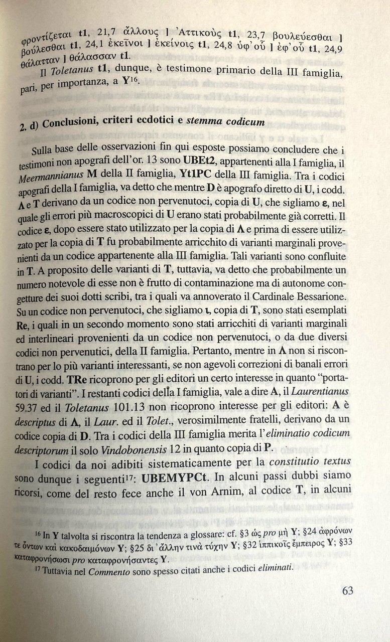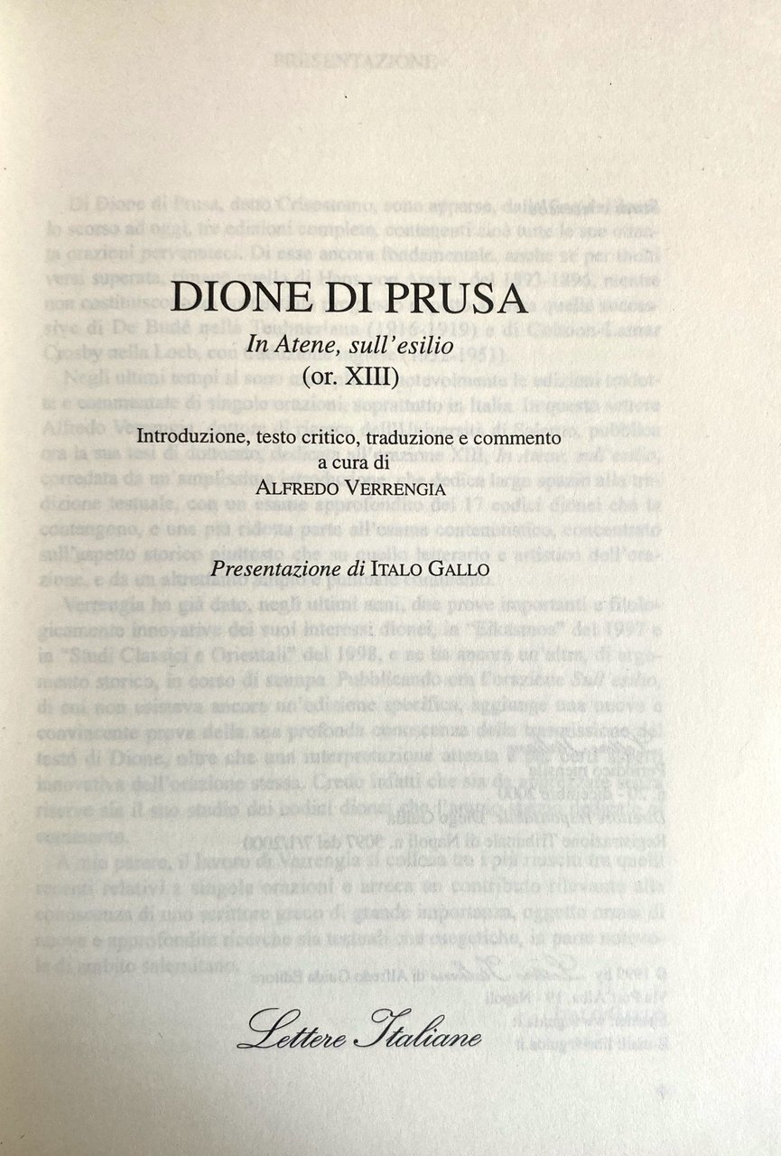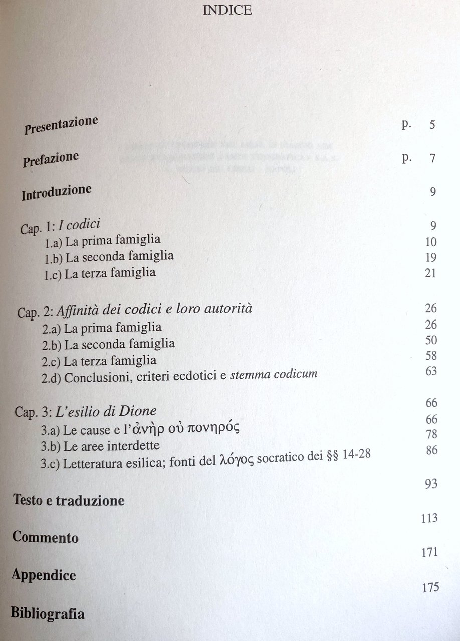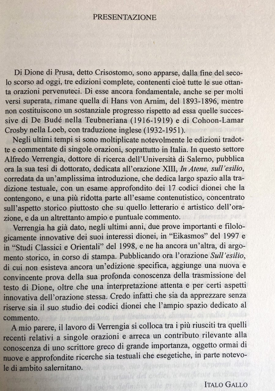 Soggetti: Letteratura greca antica Esilica Alto Imperialo Seconda Sofistica Orazioni filosofiche Dialoghi Tirannide Tirannia Diogeniche Declamazioni mitologiche Filologia classica Arte oratoria Retorica Intellettuali greci Erudizione Cinismo Stoicismo medievale Critica letteraria Studi Classici Dionei Die griechischen Schreiber Mittelalters Renaissance Scuole socratiche minori Filosofia ellenistica Greek Manuscripts Thirteenth Fourteenth Century Antichità romane Criteri ecdotici Stemma codicum Bibliografia Troiano Discorsi Olimpico Discorso funebre Melancoma Amasio Imperatore Tito Elogio Chioma Sinesio Cirene Tempe Memnone Pappagallo Moscerino Eracle Platone Rhetorike philosophousa Dio Prusa Der Philosoph Bild Essays Retori antichi Politica Narrativa Saggi Libri rari fuori catalogo Collezionismo Riferimento Esilio Hans von Arnim Edizioni critiche Età imperiale De Budé Cohoon Lamar Crosby Codici Manoscritti Sonny Apografi Qestioni ecdotiche Autorità Toletanus Marcianus Palatinus Adorno Amato Dionis Chrysostomi Orationes octoginta Favorino Brancacci Denniston Del Corno Desideri Gallinari Foucault Schiavitù Libertà Democrazia Garzya Jones Menchelli Mazzarino Levi Moles Momigliano Pohlenz Sirago Stein Verrengia Wenkebach Vogel Weynand Greco antico Traduzioni Anacoluto Antistene Areta Atticisti Bitinia Clitofonte Cobet Collazione Congettura Contaminazione Corpus Emperius Dindorf Socratico Domiziano Emendamento Euripide Erodoto Errori Congiuntivi Filostrato Foziano Geel Herwerden Iacobs Leben Lezione Morel Naogeorgus Parisinus Reiske Schmid Sciti scolio scriba Sidebottom Socrate Temistio Famiglia Varianti Verbi Vindob Testo originale a fronte Testi Ancient Literature Exilic Early Second Sophistic Philosophical Orations Dialogues Tyranny Diogenic Mythological Declamations Classical Philology Oratory Rhetoric Intellectuals Erudition Cynicism Medieval Stoicism Literary Criticism Studies Minor Socratic Schools Hellenistic Philosophy Roman Antiquities Ecdotic Criteria Coat Arms Bibliography Trojan Speeches Olympian Funeral Speech Melanchoma Amasius Emperor Titus Eulogy Synesius Cyrene Memnon Parrot Heracles Plato God Rhetoricians Politics Fiction Rare Books Out of Print Collectibles Reference Exile Critical Editions Imperial Age Codices Apographic Questions Authority Slavery Freedom Democracy Translations Anacoluthon Antisthenes Aretas Atticists Bithynia Clitophon Collation Conjecture Contamination Domitian Amendment Euripides Herodotus Errors Conjunctives Philostratus Photianus Lesson Scythians Scholium Scribe Socrates Themistius Family Variants Verbs Original text opposite Texts