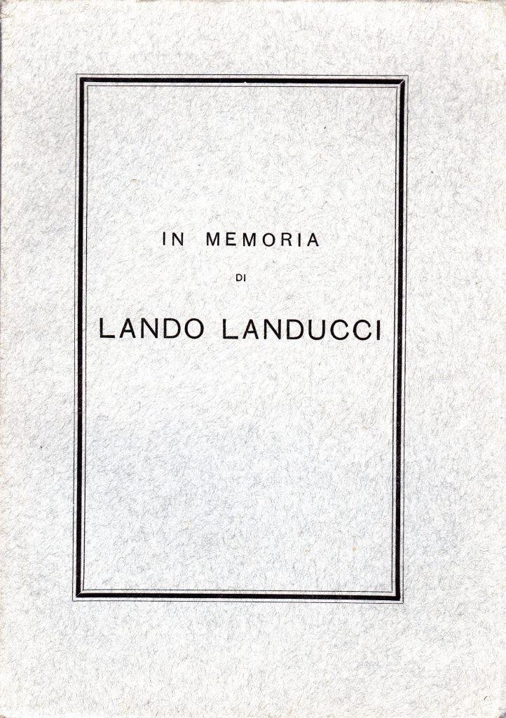 In memoria di Lando Landucci, prima edizione maggio 1938, pp. 82 formato 17,5 x 25.<BR>Copertina morbida di colore grigio con titoli in nero al piatto anteriore.All'interno presente una tavola fotografica in b/n, rappresentante Lando Landucci. <BR>Ottime condizioni.