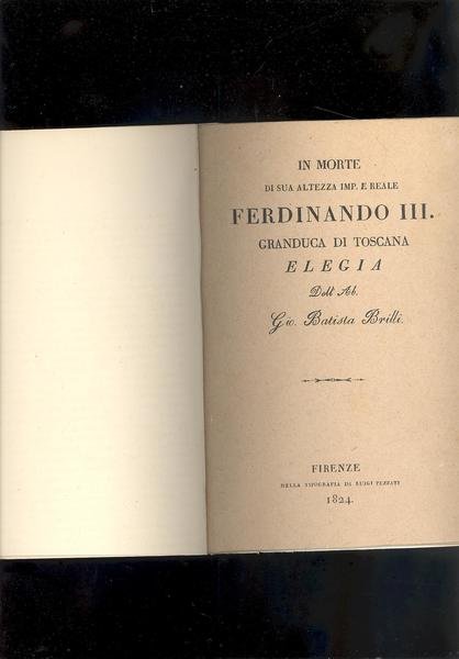 IN 8°, pp.7. COPERTINA IN CARTONCINO MUTO. ELEGIA IN MORTE DI FERDINANDO III, GRANDUCA DI TOSCANA DELL'ABATE BRILLI. OTTIMA CONSERVAZIONE. ID 4591