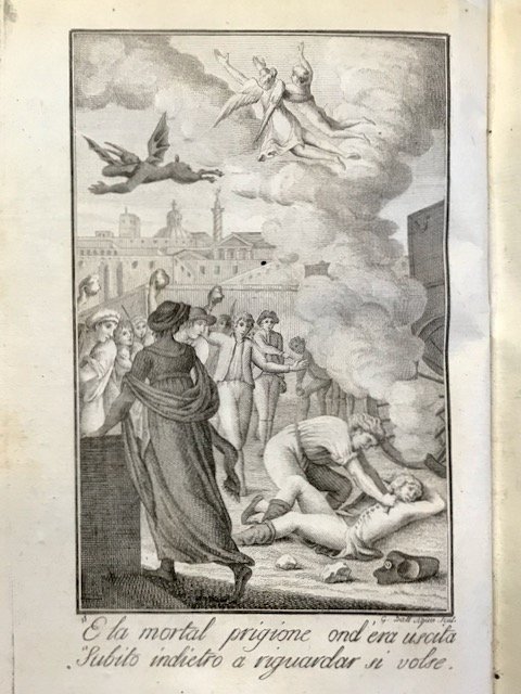 In-8° (cm. 17,8), legatura coeva in mezza pelle con titolo in oro su tassello e fregi floreali in oro al dorso (usure); tagli spruzzati; pp. 158 in buono stato, con 1 tavola illustrativa in rame di Dall'Aqua (assassinio di Ugo di Basseville); leggere fioriture. Poemetto detto Bassvilliana scritto in terzine e rimasto incompiuto, famoso per l'appassionata esaltazione del segretario della legazione francese a Napoli, ucciso a Roma a causa delle sue idee rivoluzionarie. Esemplare più che discreto. (NF3)
