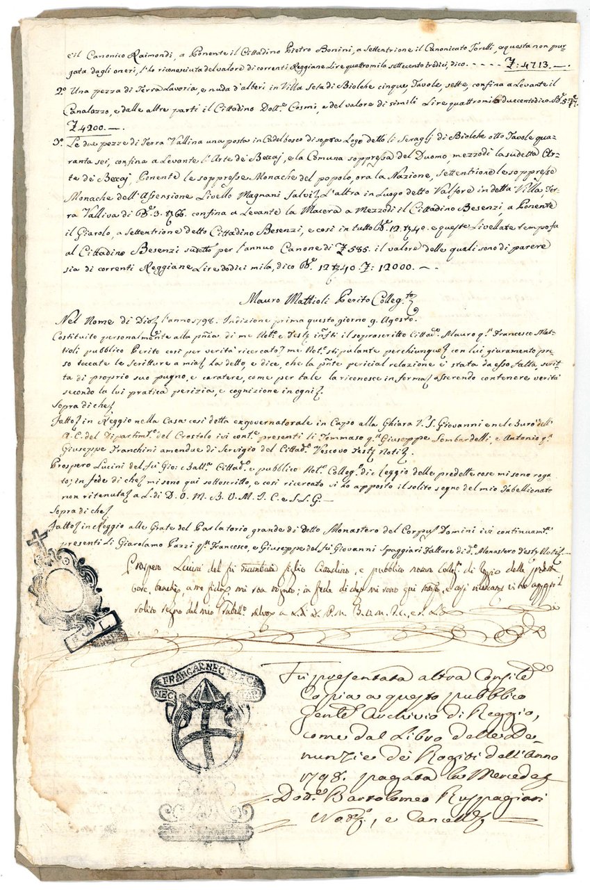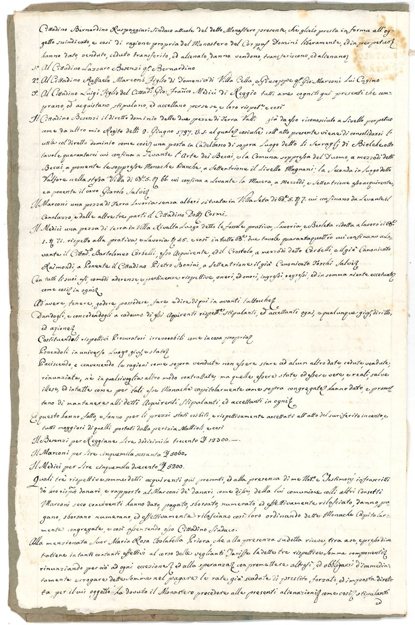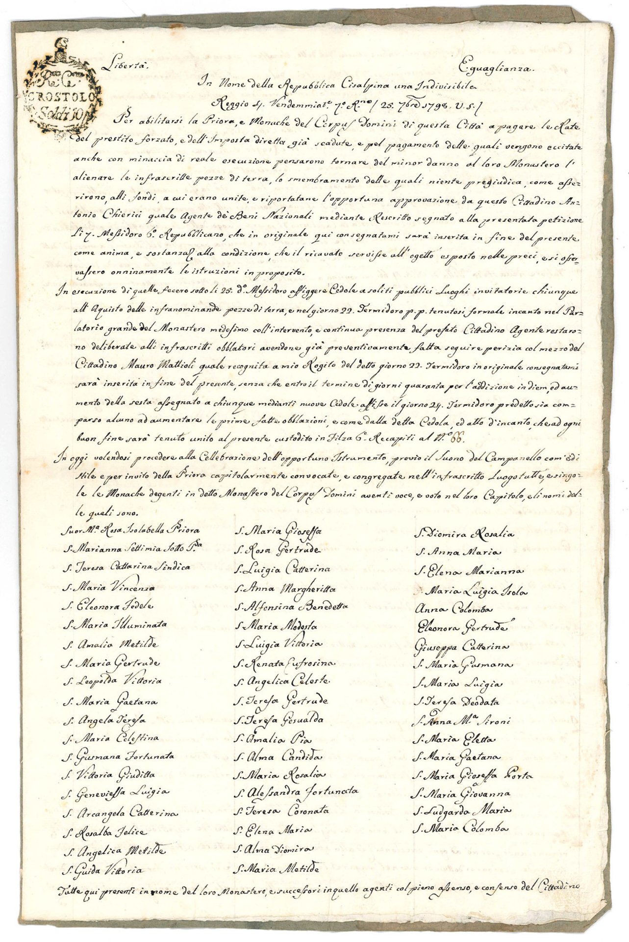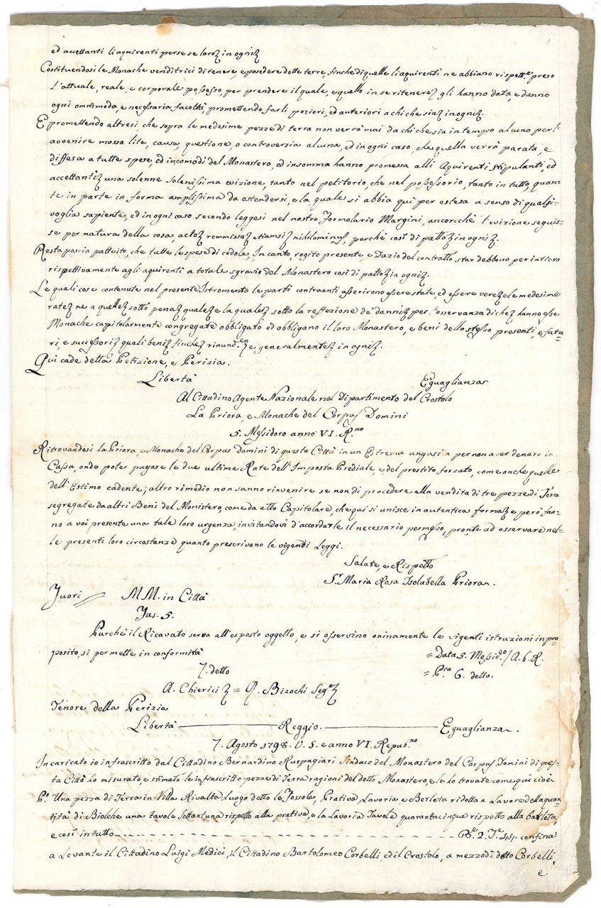 Bifolio (mm. 375x245) scritto su tutte e quattro le pagine. Brossura azzurra coeva. Timbro di tassa locale alla prima pagina e timbri notarili all'ultima pagina. Esemplare molto ben conservato. Per pagare un prestito forzoso e l'imposta diretta, entrambi già scaduti, e per evitare la confisca dei propri beni, la badessa e le monache del monastero del Corpus Domini di Reggio Emilia accettarono di vendere all'asta alcuni terreni di loro proprietà. Questo documento legale contiene tutti i dettagli dell'operazione ed elenca i nomi delle monache chiamate a partecipare alla vendita. Alla fine del documento è scritto che una altra copia ufficiale di questo atto è stata depositata nell'archivio di Reggio Emilia. Documento molto interessante che permette di far luce su una pratica diffusa durante gli anni della Repubblica Cisalpina sotto l'occupazione napoleonica, ovvero la soppressione o il ridimensionamento di un gran numero di istituzioni religiose in Italia, i cui beni venivano venduti in aste pubbliche.