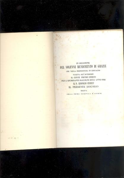IN OCCASIONE DEL SOLENNE RENDIMENTO DI GRAZIE CHE NELLA PROPOSITURA DI CERTALDO FACEVA ALL'ALTISSIMO IL CONTE PIETRO ONESTI PER L'ESUBERANTI RACCOLTE<BR> DELL'ANNO 1844