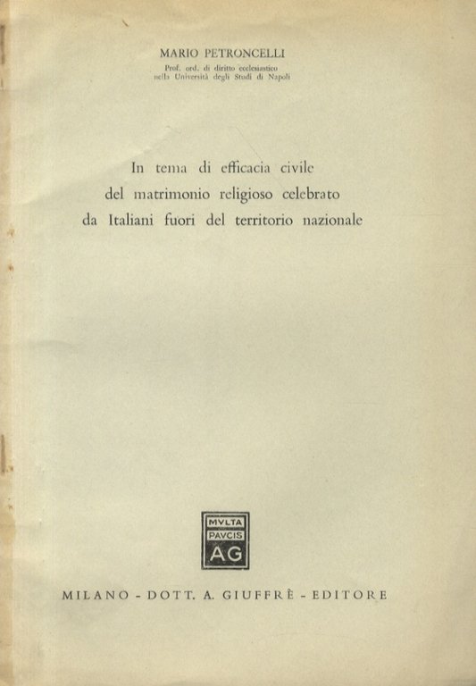 Milano, Giuffrè, s.a., in-8, brosssura editoriale. Estratto di pp. 32 da “Raccolta di scritti in onore di Arturo Carlo Jemolo”, Vol. primo-Tomo secondo.
