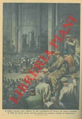 In uno stabilimento di Firenze gli operai assistono, in abito da lavoro, ad un concerto eseguito da sessanta colleghi del Dopolavoro.