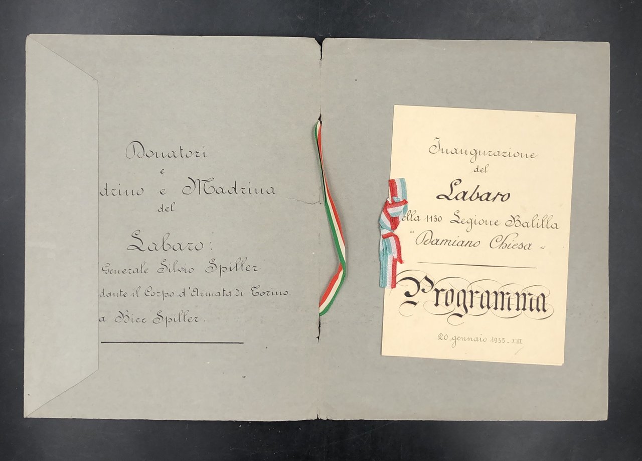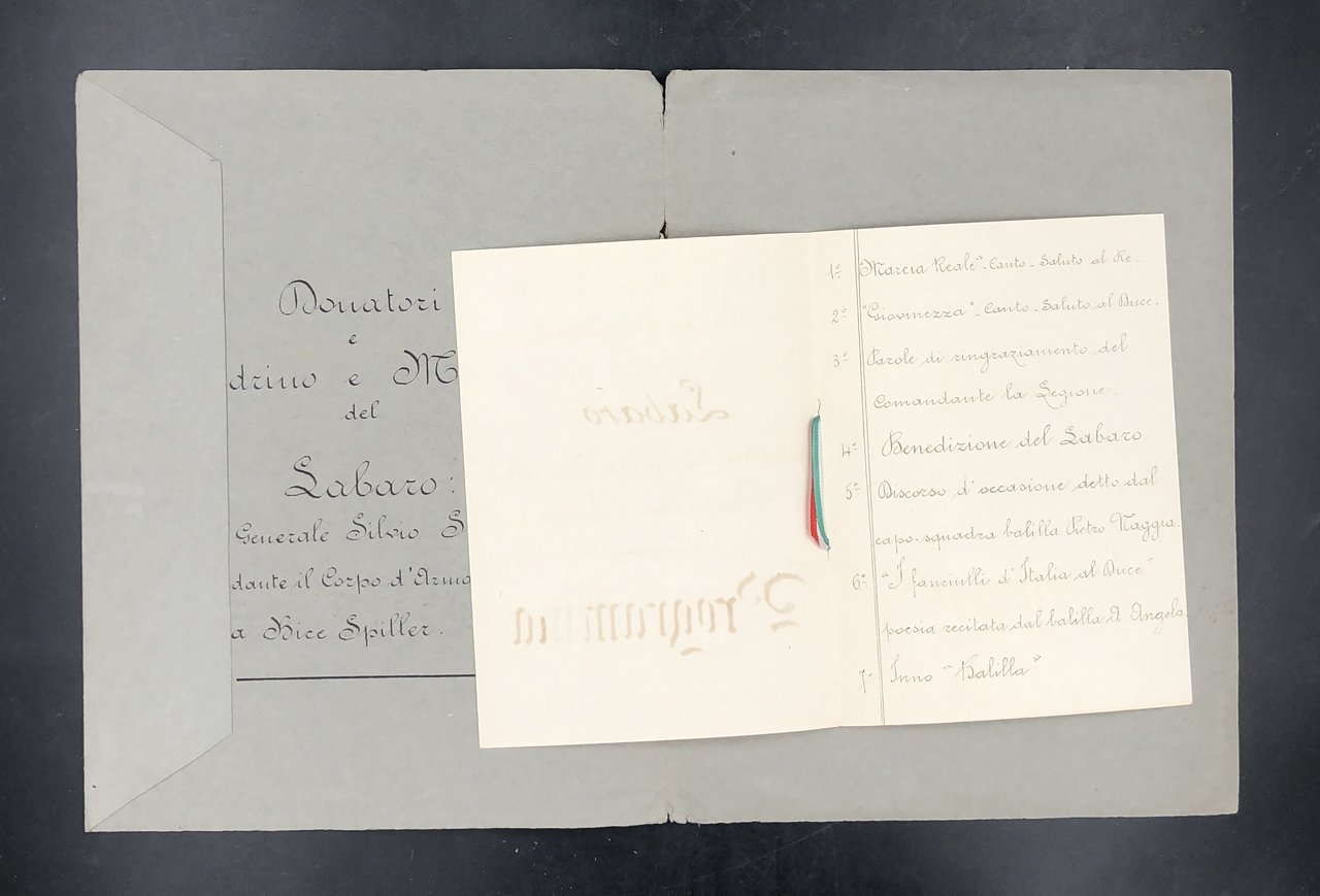 4 facciate di cm. 16,6x12 di cui due scritte in calliografia a penna e ornate da fiocco tricolore passante al dorso; entro carpetta inb cartoncino grigio con aletta di chiusura e nastrino tricolore passante al dorso della carpetts e con doppio fiocco; al piatto ant., in calligrafia a penna, data, titolo a grandi caratteri e dedica "Al piccolo e bravo oratore Pietro Maggia [Naggia?] in segno di lode e di grande affetto (firmato Maria Chiadò-Fiorio)". In programma Marcia Reale, canto, saluto al Re, "Giovinezza" e saluto al Duce, parole del Comandante la Legione, benedizione, discorso del Capo-Squadra balilla Pietro MAGGIA [Naggia?], poesia "I fanciulli d'Italia al Duce" recitata dal balilla A. ANGELA, inno "Balilla". Cimelio e pezzo unico.